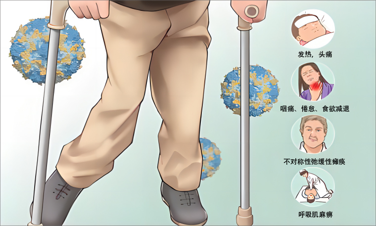脊灰病毒的传染性很强,主要通过粪-口途径传播。感染初期患者可能出现发热、食欲不佳、恶心、呕吐、头痛、咽痛等症状。部分患者因病毒侵犯中枢神经系统,损伤脊髓前角运动神经细胞,从而导致肢体松弛性麻痹,造成终身残疾,严重者会因呼吸肌麻痹而死亡。